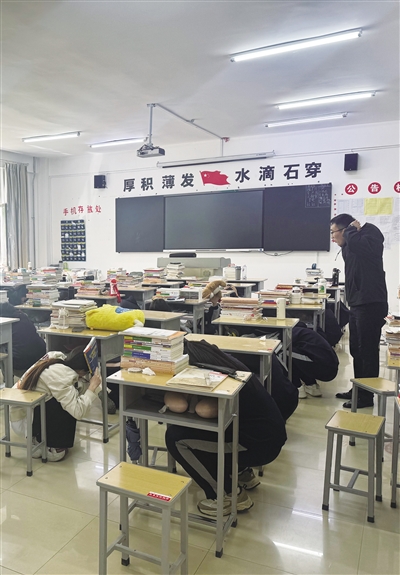 讲座结束后,随着警报声的响起,地震应急演练正式拉开帷幕。学生们迅速按照讲座中学到的地震避险方式,双手抱头、蜷缩身体、降低重心,就近躲到课桌下紧急避险。第二波疏散警报响起时,各班在老师的引导下护头弓腰,沿预定逃生路线快速撤离至操场安全区,各环节衔接紧密,全程用时2分38秒。