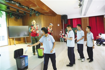 在实操环节,学生们依据所学知识,将不同类型的模拟垃圾准确投入对应的分类垃圾桶内,在实践中深化了对垃圾分类标准的认知,带动青少年们积极争做绿水青山的守护者、环境保护的示范者、生态理念的传播者。