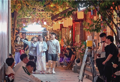 端午假期已经结束,但大同古城依然游客众多。每到夜幕降临,华灯璀璨,街头吉他手浅唱低吟,非遗工坊灯火通明。