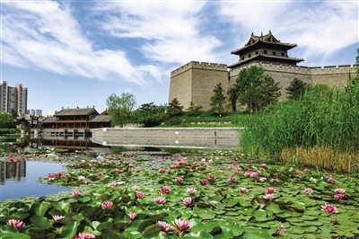 本报讯 (记者 双红) 近日,城墙带状公园内的睡莲陆续绽放,蓝天绿树碧水与古城墙相互映衬,构成了一幅美不胜收的画卷。