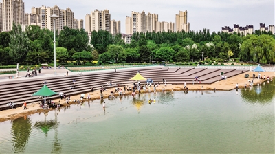 7日恰逢周末,记者看到遮阳棚位于观演看台与沙滩交界处,高约5米,黄、绿、蓝三色醒目,棚顶装有太阳能板,内置蓝牙音箱。这些遮阳棚与澄澈的“大同蓝”、碧波荡漾的湖水及周边廊庭、绿化带融为一体,丰富了广场的空间层次感。