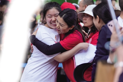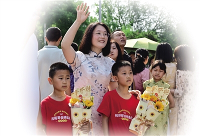 7时30分,北京一零一中学考点外,一位家长挥手目送孩子步入考场,不忘拿起手机拍下孩子的背影。安检通道前,送考教师早已列队等候,与考生击掌拥抱,加油打气。