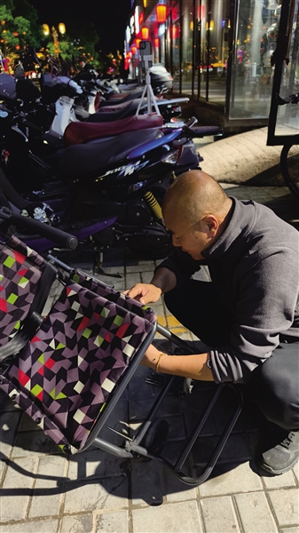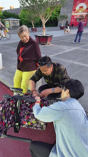 6月3日上午,李女士与姐姐带着84岁的母亲来大同探亲旅游。当晚7时55分,结束古城墙游览后,她们打算用轮椅推着母亲回住宿地,却发现轮椅一处连接架的螺丝不在了,导致推行困难。就在她们焦急查看时,一位骑自行车经过的七旬老人折返询问,得知情况后,老人骑车前往附近工地,几分钟后便带回一块钉着长钉的木板和一小段钢筋。他用钢筋撬下长钉,为轮椅做好临时固定,并提示这只是应急处理,还得找家修理铺配个螺丝。