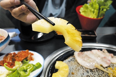 烤肉吃得极为尽兴,再来几片烤菠萝便是锦上添花。淡黄色的菠萝片放上烤盘,一边滋滋作响,一边飘出清甜的香气。几次翻转反复,菠萝片有了焦边儿,这时的菠萝已烤到最佳状态。咬一口,汁水爆出,酸甜可口,清爽解腻,堪称烤肉的绝配。最后,再来一碗酸辣清爽的韩式冷面,才是一次完美的舌尖之旅。
