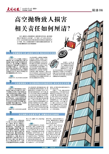 如今,建筑物上的抛掷物致人损伤事件时有发生,高空抛物被称为“悬在城市上空的痛”。为了保护人们“头顶上的安全”,《中华人民共和国民法典》对高空抛物的治理规则及致害责任作出了规范。那么,实施高空抛物行为要承担哪些法律责任呢?在无法确定肇事者时又该向谁索赔呢?