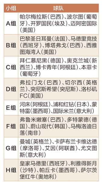 因此,尽管有新科英超、西甲、意甲冠军利物浦队、巴塞罗那队、那不勒斯队等“遗珠”,本届比赛的参赛阵容仍然堪称豪华。近四年两夺欧冠冠军的西甲皇家马德里队、新科欧冠冠军法甲巴黎圣日耳曼队、英超劲旅曼城队、德甲豪门拜仁慕尼黑队,以及尤文图斯队和国际米兰队两支意甲老牌强队等代表欧洲出战;弗拉门戈队、帕尔梅拉斯队、博卡青年队等巴西和阿根廷传统劲旅拿下南美洲参赛资格;近年在非洲和亚洲俱乐部赛事中有不俗表现的开罗国民队、利雅得新月队,以及梅西、苏亚雷斯等老将坐镇的东道主迈阿密国际队,本届比赛有不少“强强对话”。如欧冠冠军巴黎圣日耳曼对解放者杯冠军博塔弗戈、曼城对尤文、皇马对利雅得新月、拜仁对博卡等,皆为众多球迷关注的焦点。