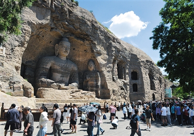 云冈石窟蕴含着各民族交往交流交融的历史内涵。云冈研究院历史与民族融合研究中心主任王雁卿说,云冈石窟造像按照洞窟形制和造像艺术风格可以分为早中晚三期,早期是文成帝时期开凿的“昙曜五窟”,由于有西来的凉州僧团和工匠的参与,造像手法继承了凉州模式,这一时期的造像面形方圆,双肩齐挺,体形健壮。特别是“令如帝身”、帝佛合一的理念和宗旨,又象征着拓跋鲜卑民族的精神与追求。中期为献文帝、冯太后、孝文帝时皇家营造的大窟大像,云冈石窟从洞窟形制到造像题材、造型风格都具有明显的汉化特征。大型双窟是这一时期的标志,双窟的平面呈方形,石雕群像构图繁杂,玲珑精巧。晚期为北魏都城迁洛后民间补刻的窟龛,造像主要特征为面容消瘦、长颈溜肩,这种造像属于北魏后期出现的“秀骨清像”艺术形象。说到云冈模式对其他石窟寺的影响,王雁卿告诉记者,云冈模式在形成的过程中,不断吸纳各地的艺术资源,云冈模式形成后,这种全新的造像模式又广泛传播到各地,可以说文化和艺术的交流在这个时代融汇贯通。