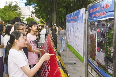 图为昨日,考生和家长在大同一中北校区考点前查看考场分布示意图。