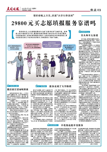 至于服务是否有必要,那就见仁见智了。一位学生母亲称,自己此前曾对志愿填报服务进行过详细了解。“会一对一给孩子做能力、性格等测评,结合个人兴趣,出一份报考方案,供家长填写到报考系统中。”她坦言自己颇为心动,“感觉有人帮你一起给孩子把把关,多少更稳妥些。”