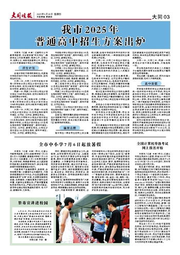 本报讯 (记者 田雁) 记者昨日从市教育局获悉,为全面实施“阳光招生”,确保招生工作政策透明、程序公开、过程公平、结果公正,有效促进教育公平,我市出台2025年普通高中招生工作实施方案。