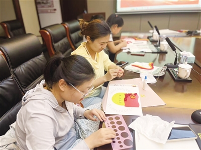 在党徽衍纸画制作环节,社区工作人员详细讲解衍纸技巧,从卷、捏、拼等基础操作到复杂造型设计,党员们认真聆听、动手创作,以五彩衍纸条精心制作。大家相互交流协作,一幅幅融合艺术巧思与爱党情怀的党徽衍纸画应运而生。
