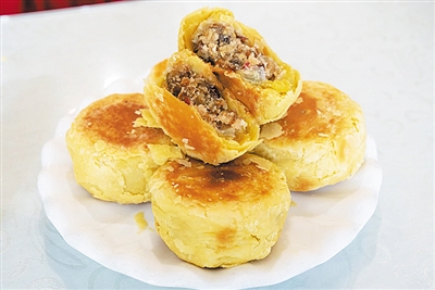 店里吧台的上方,张贴着馅饼的品种及价格,除传统的牛肉大葱馅饼、羊肉胡萝卜馅饼、猪肉大葱馅饼外,还有猪肉韭菜馅饼、酸菜土豆泥馅饼、白萝卜馅饼和素馅饼。烙馅饼是“三人组合”进行的流水线作业,拌馅、包馅饼、烙馅饼各司其职。他们每天早上九点到店,先和面、醒面,然后制作馅料,中午时分,开始“作业”。问起馅饼受欢迎的缘由,薛继东说,首先是肉质好,每天他都要亲自采买所需肉料,而且要亲眼看着卖家将他选的肉加工成肉馅;其次是皮薄馅大,馅饼里的馅是一张厚厚的肉饼;第三是现烙现卖。最具特色的要数酸菜土豆泥馅饼,土豆蒸熟压成泥,再与肉丁、酸菜一同翻炒,炒好晾凉才能做馅。酸菜土豆泥馅饼外皮酥软、馅料软糯,别有风味。