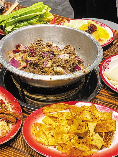 重点来了,那就是用烤肉原汤煮出的美味面片。吃得差不多时,锅中加入开水,下入手工揪好的面片。当面片吸收了肉和蔬菜的汤汁精华,变得筋道又美味,一碗下肚,幸福感爆棚。
