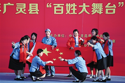 1日,在广灵县剪纸文化广场,广灵县老干部活动中心老年大学的学员们表演歌剧选段《绣红旗》。