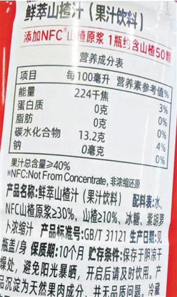 在超市,一种鲜萃山楂汁饮料瓶上主打“添加NFC山楂原浆,0添加色素、防腐剂、甜味剂,1瓶约含山楂50颗(以每颗山楂6克计算)”,实际上也是果汁饮料,配料表中有水、NFC山楂原浆、山楂、冰糖、紫胡萝卜浓缩汁。记者在电商平台找到该款产品,客服解释说,该产品的0添加指的是0添加工业添加剂。页面中有很隐蔽的小字显示,0添加甜味剂指的是0添加甜蜜素(人工合成甜味剂)。