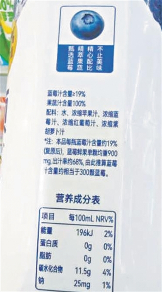 一种纸盒包装的100%果汁含蓝莓复合果蔬汁,包装正面除了醒目的“100%果汁含量”,还用大字印着“300颗蓝莓”。配料表显示,产品由水、浓缩苹果汁、浓缩蓝莓汁、浓缩红葡萄汁、浓缩紫胡萝卜汁组成。配料表下方还有一个注释:本品每瓶蓝莓汁含量约19%(复原后),蓝莓鲜果单颗均重900mg,出汁率约68%,由此推算蓝莓汁含量约相当于300颗蓝莓。