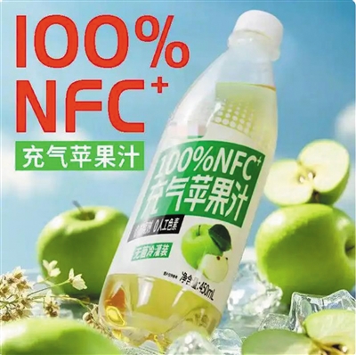 在电商平台,情况更加五花八门。一款100%NFC充气苹果汁,店铺页面用非常亮眼的 红 色 写 着 大 大 的“100%NFC”,而且强调0添加。不过,配料表上显示,产品由水、浓缩苹果汁、NFC苹果汁、二氧化碳组成。记者询问时,店铺客服回复,不是纯NFC果汁,是“NFC+”。经客服提醒,记者才注意到店铺页面上所有NFC字样的右上角都有一个小小的“+”。