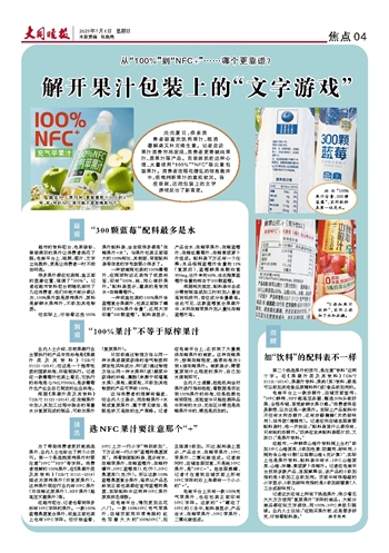 记者这次在线上和线下挑选果汁,很少看见大大方方使用“复原果汁”字样的商品。大部分商品都在玩文字游戏,用100%、NFC来吸引眼球。业内人士总结:“在购买果汁前,还是要多研究、仔细看配料表。” 据京报网