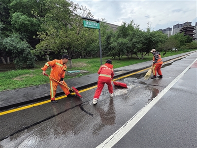 本报讯 (记者 杨昱郁) 连日来,我市降雨较多,路面湿滑、垃圾难清,但身着橙色工作服的环卫工们坚持清理淤泥、清扫积水、擦拭设施、清除粘在地上的垃圾,为城市“擦亮”每一个角落。