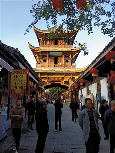 中天楼高高地矗立在十字路口,犹如鹤立鸡群,这该是古城的标志建筑和中心地带了。但见游人摩肩接踵,川流不息,尽显古城的繁华气象。古街上的店铺鳞次栉比,一家挨着一家,占据主导地位的,要数张飞牛肉和保宁醋了。张飞在阆中曾镇守7年之久,在当地家喻户晓,以张飞为这里的特产命名,也是顺理成章的事了。据介绍,保宁醋始于五代后唐时期,已有1000多年历史。明末清初,有宫庭醋师定居阆中,将宫廷酿造手法融合保宁传统工艺制醋,醋色泽红棕、醇香回甜、酸味柔和、保质期长,深有大众喜爱。