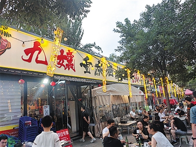 户外的灯串亮了起来,映着满桌的热辣红汤和升腾的香气。食客碰着酒杯谈笑风生,火锅的咕嘟声、烧烤的滋滋声、人们的欢笑声混在一起,构成了最生动的人间烟火。