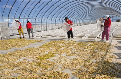 图为16日,在一家黄花加工企业内,工作人员正在晾晒黄花。
