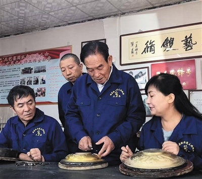 7月2日上午,大同古城永泰街一家名为“天艺昌”的店铺内,琳琅满目的铜制品吸引了众多游客。相邻的工作室里,叮叮当当的敲打声不绝于耳,匠人们忙着赶制一批铜器。当天,久不到店的李安民老人特意来到店里,商讨一件定制铜器的铸造与捶打技法。
