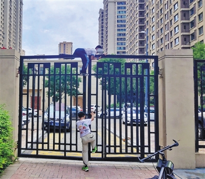 本报讯 (记者 龙中华) 暑假本是孩子们放松快乐的时光,却屡屡出现令人揪心的安全隐患。16日,记者途经恒顺路北段一小区门口时,发现惊险一幕:两名十一二岁的男孩竟以近3米高的铁门为“赛场”,比拼攀爬速度。