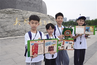 图为日前,孩子们在市博物馆门前展示研学手册。 本报记者 张燕伟 摄