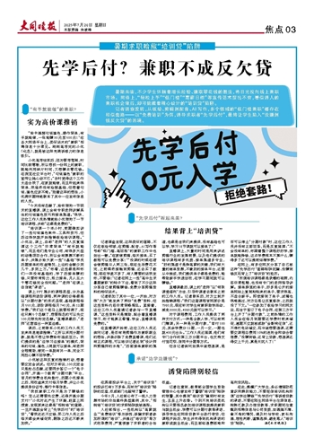 在网上,有多位网友分享了自己被这种“先学后付”套路陷阱坑骗、没赚到钱反而背上了“培训贷”的经历。