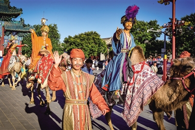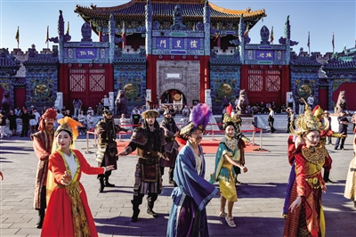21日下午,记者在代王府广场看到,不少市民和游客或打卡拍照,或了解节目看点,或讨论代王府及九龙壁的历史。不一会儿,精彩的表演轮番上演:不倒翁小姐姐衣袂飘飘,与游客暖心互动;武术表演让人热血沸腾;骆驼巡游震撼登场,演员们不时与观众互动,高大的骆驼让人仿佛遇到古代丝路商队;曼妙的舞姿、动感的音乐,让人直呼创意新颖。