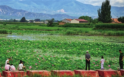 300余公顷的湿地内,碧绿荷叶层层叠叠,粉色荷花亭亭玉立,在微风中摇曳生姿,呈现出“接天莲叶无穷碧,映日荷花别样红”的美景。