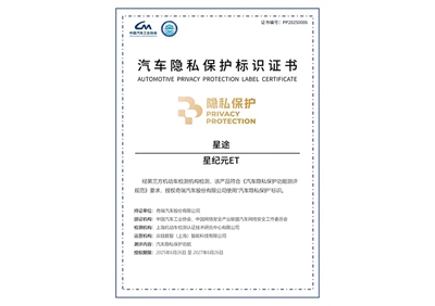 2025年6月26日,中国汽车工业协会与中国网络安全产业联盟汽车网络安全工作委员会联合宣布,星途星纪元ET通过了第三方检测机构的严格测评,符合《汽车隐私保护功能测评规范》的各项要求,正式获得《汽车隐私保护标识证书》,并获准使用“隐私保护”标识。