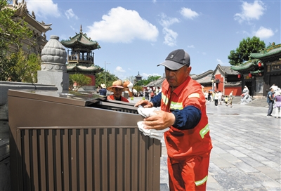 为了避开高温时段,环卫工人调整了作业时间,充分利用早晚凉爽时段进行高效清扫。王志军介绍,清晨先对街道及背街小巷进行普扫,随后清洗垃圾桶、果皮箱、路牌、护栏等“城市家具”,确保公共设施整洁如新。早上8点前,早间清扫工作暂告一段落,但随着游客增多,环卫工人仍需不断巡视,随时清理烟头、碎屑等零星垃圾。中午高温时段,单位安排工人充分休息,既有效保障了他们的健康,又确保了城市环境的洁净。