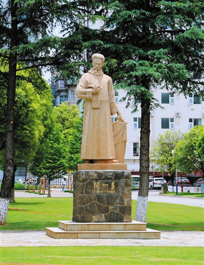 云南师范大学主教学楼前是开阔的草坪,这就是著名的民主草坪。草坪中央矗立着闻一多先生的塑像,仿佛在诉说着当年的热血与抗争。