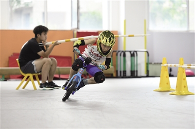 “脚放正、落脚要快、往前落,出发!”6岁的张耘赫利索地穿戴好头盔、护膝等骑行装备,骑在儿童平衡车上,身子向前微倾,随着教练一声令下,双腿一蹬,如箭般从起点冲了出去,流畅地拐过几个弯后,向终点冲刺。他的动作娴熟老练,围观的家长也对他的车技赞不绝口:“这小孩儿速度真快,厉害!”