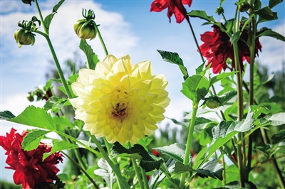 近日,记者在文瀛湖风景区看到,园内有多处成片种植的大丽花,主要有红、黄两种颜色。大丽花的花茎直立粗壮,有多个分枝,每个分枝上又会长出多个花苞。有趣的是,初期花苞渐大时,支撑它的茎会自然弯曲下垂,为花苞搭起一道保护屏障;待花苞长到一定程度,弯曲的花茎又会慢慢挺直,最终使绽放的花朵与地面呈垂直状态。
