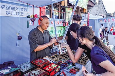 据了解,平遥推光漆器是中国四大名漆器之一,以手掌推光工艺闻名。2006年,经国务院批准,平遥推光漆器髹饰技艺列入第一批国家级非物质文化遗产名录。本次活动,刘培义不仅带来首饰盒等传统手工漆器产品,还有在传统技艺基础上开发的耳坠、项链、衣服挂饰和钢笔、书签等文创产品。刘培义表示,参加这次活动不仅是为了让非遗技艺走进大众生活,更是想通过市集这个窗口,深入了解市场需求和消费者喜好。