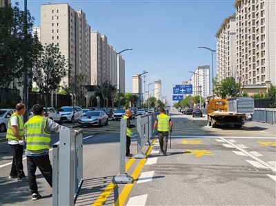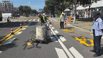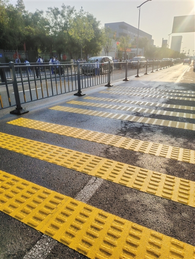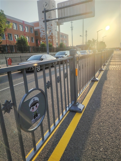 8月30日下午,记者在现场走访时看到,北师大附中门前新划的人行横道和震荡标线既醒目又降噪;实验小学文博分校门前道路中央加装了带有卡通交警提示牌的隔离栏,提醒学生过马路走斑马线,远离大型车辆。