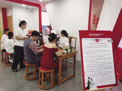 “重视婚育、尊重生育,适龄婚育、优生优育,破除陋习、婚事新办,育儿责任,夫妻共担……活动现场,工作人员向每对新人发放一份《新时代婚育文化建设倡议书》,字里行间既有中华民族传统美德的传承,也有契合时代需求的婚育观念引导。同时,工作人员在现场还精心布置了宣传展板,内容涵盖婚前健康检查的重要性、孕前优生健康检查、科学育儿知识等多个主题,新人们在等候办理登记的间隙,可随时浏览学习相关知识。刚刚领取结婚证的张先生和李女士表示:“这样的活动很有意义,让我们对婚姻和育儿有了更科学的认识。”