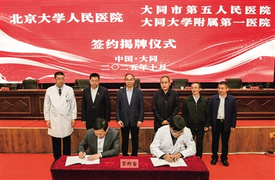 本报讯 (记者 郑苗苗) 一纸协议,一块红绸覆盖的牌匾,为我市及周边地区百姓健康带来了福音。10月22日,北京大学人民医院与大同市第五人民医院、大同大学附属第一医院专科区域协作中心正式成立。至此,北京顶尖医疗资源将顺着协作的纽带汇入大同,让市民多一份“家门口找北京专家”的踏实,少一些跨省看病的奔波焦虑。