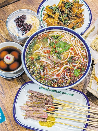 酸口爱好者别错过哆依果酸牛肉串,酸甜的果酸渗透进肌理,搭配微辣口感,层次十足;普洱茶汤圆藏着温柔滋味,糯米的绵软裹着淡淡的茶香,解腻又暖胃。餐后来一碗玫瑰黑糖冰豆花或老昆明鲜奶米布,豆花入口即化,米布融合米香与奶香,是属于云南的甜蜜收尾。