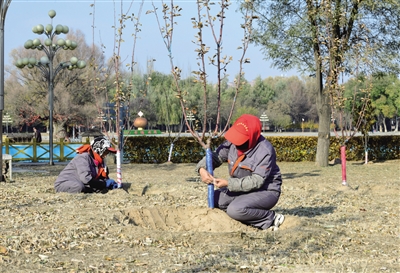 工作人员对今年栽种的果树格外上心,不仅在根部堆起土堆,还为树干包裹保温布,如同穿上“防寒衣”。园内的萝卜花、美人蕉、大丽花等植物被从地面挖出,将根部晒干后收藏到公园地窖,待来年重新栽种。