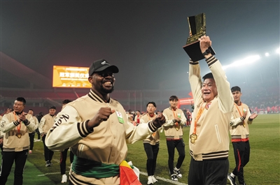 11月8日,辽宁铁人队主教练李金羽(前右)举起冠军奖杯庆祝夺冠。