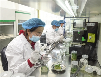 近日,在左云县三屯乡山西蓬勃农业科技公司的接种室内,技术人员正在进行马铃薯种苗繁育。