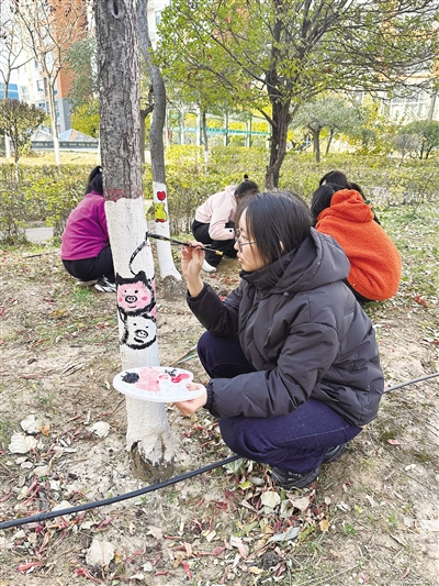 本报讯 (记者 段雨萌) 近日,平城区迎宾街道、和泰社区携手桐城金域物业共同开展了小区树干美化公益活动,让单调的树干变身小区里的“风景线”,。