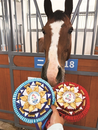 本届全运会盛装舞步的团体和个人比赛,17岁的上海队选手徐墨菲与爱马“好好”收获一金一银。在马房里,徐墨菲专门给“好好”和这两朵象征着荣誉的“马花”拍了张合照。“有经验的马,戴上‘马花’就知道自己今天表现很好,会很傲娇的。”
