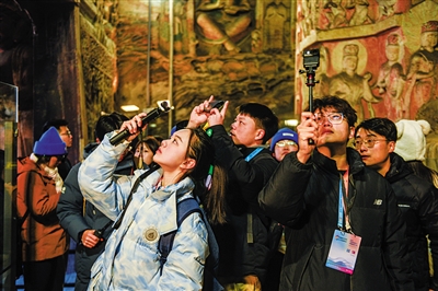 初冬的云冈石窟静谧而庄严,主播一行沿着依山开凿的洞窟缓缓前行,在讲解员的引导下,逐一参观各个洞窟中精美绝伦的造像艺术。面对宏伟的造像,众人无不叹服古代工匠的卓绝技艺。多位主播当即架起设备,通过短视频与实时镜头,将石窟的壮美同步传递给全国观众。