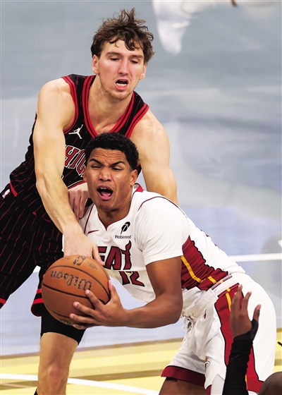 11月21日,公牛队球员布泽利斯(上)与热火队球员史密斯在比赛中拼抢。