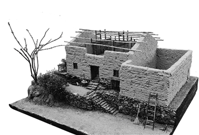 现在,迷你版的老宅已有模有样:石砌的基座、黄土夯筑的外墙、古朴的屋顶木梁、门前的小树与菜地、屋内摆放的木桌和木凳、墙上还贴着褪色的年画。